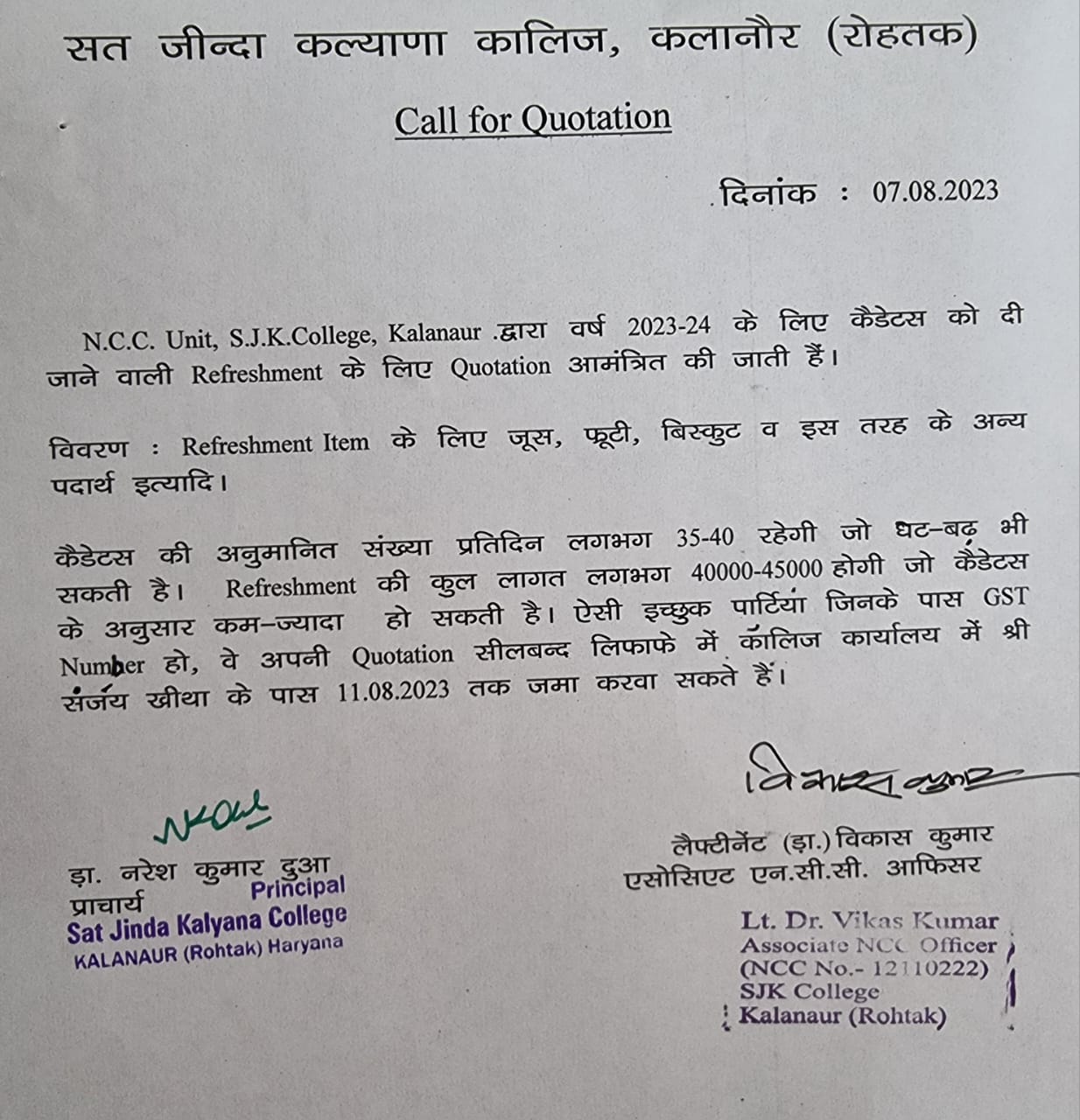 In welcoming you, I bring with me 50 years of celebrated history of this institution. During the course of past 50 years of existence, we have much to be proud of and more is to be accomplished in future. In these five decades, the college has overcome every obstacle and challenge to become a brand in itself. Our college has earned a great reputation in imparting value based education in Humanities, Commerce and Science. With the blessings and under the auspicious patronage of Mahant Khushhal Dass ji Maharaj, we hope to achieve more milestones in the future. Thanks to the unwavering support from the Governing Body of college, helmed by the President, Sh Shadi Lal Batra Ji (Ex-M.P.), we have been able to revive ourselves from the unprecedented misfortune that befell in the year 2016 (during the Agitation for Jat Reservation). And with their constant support, we are hopeful to complete more infrastructural projects in future. Our college has highly qualified teachers who are professionally competent and committed to their vocation. The teaching faculty keeps themselves updated by participating in a number of Faculty Development Programmes. All our educational endeavours aim at helping the students to be intellectually competent, morally upright, spiritually mature, socially responsible and environmentally conscious beings. Keeping in mind the essence of college's motto, ‘Vidya-Vivek-Vikas’ the college provides a congenial environment to students for acquiring ‘knowledge’, ignite a ‘sense of discernment of right and wrong’ and thereby lead them to the path of ‘development.’ Our college provides an inclusive environment where equal opportunity is provided to all the students irrespective of their gender, caste, financial or social background. Students in our college are offered numerous opportunities to enhance their skills and talent. We have wide spectrum of cells and clubs in which activities are organized to sensitize the students towards playing active role in social and environmental causes. Although our college is situated in the rural heart land in Haryana, yet our students have left their mark not only in the field of sports by bagging national level positions but they have also excelled in the field of academics by getting University merit positions. I am sure that the campus culture of our college will propel each one of you to realize your full potential; encourage and motivate you to reach your goals. I welcome you all to SJK PG College. May you have a joyful learning and worthwhile experience in this great institution.